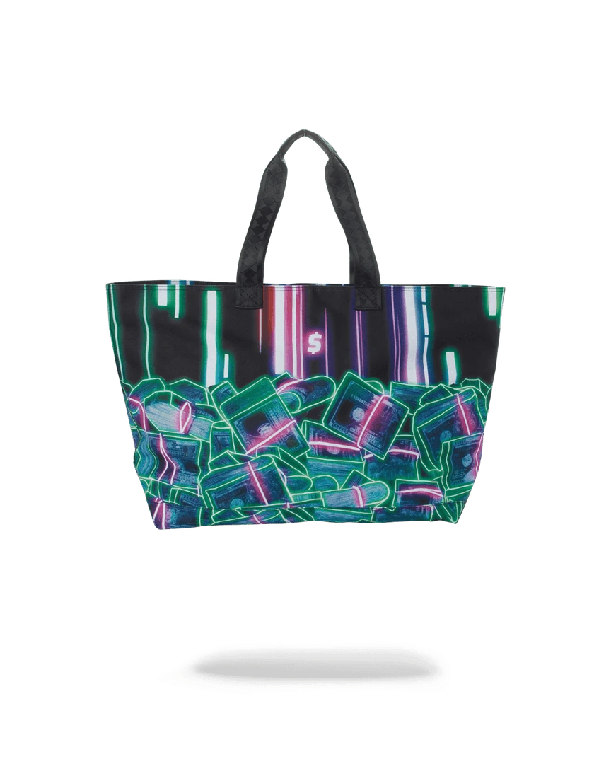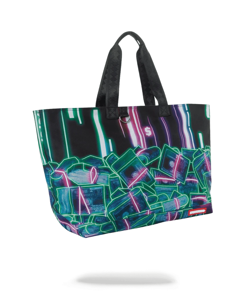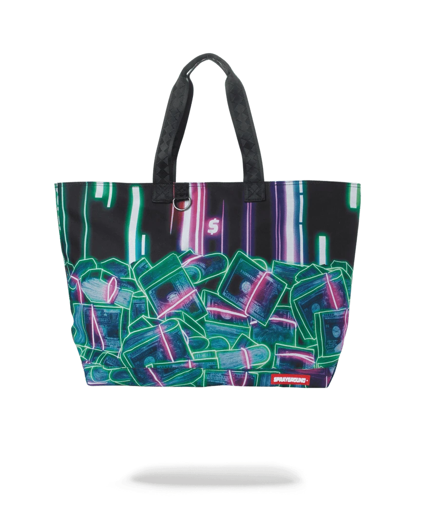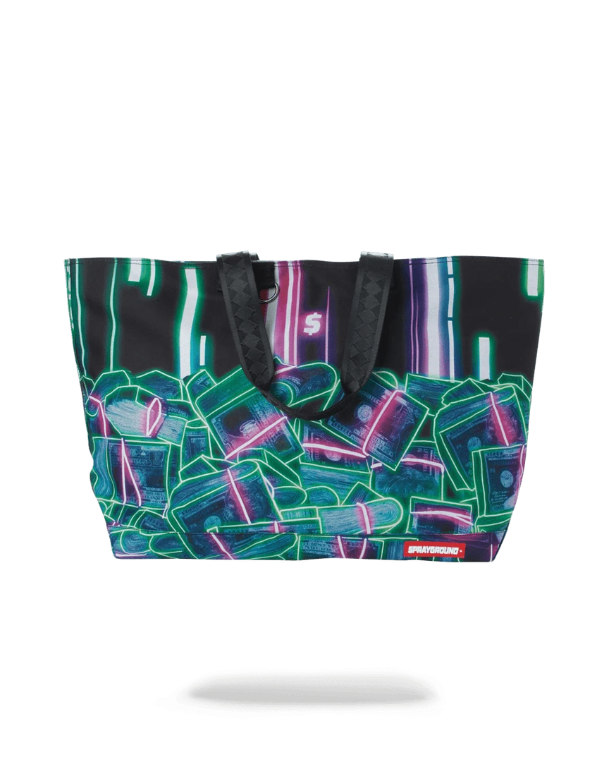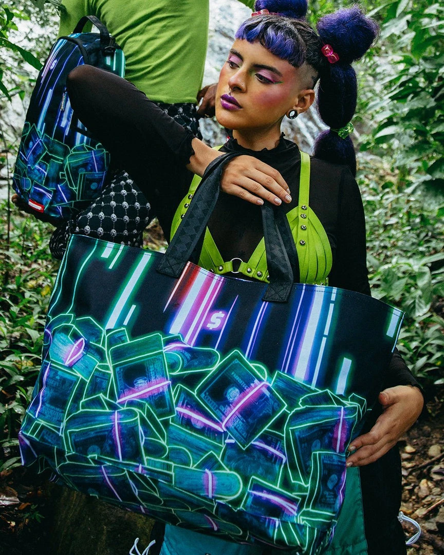 SPRAYGROUND 2077. The Neon Lights of Shark City Glow at Night with The New Limited Edition Crypto Stacks & Nite Dragon Backpacks, Luggage, Tote, Pouch & FaceMask. GLOWS NOW!