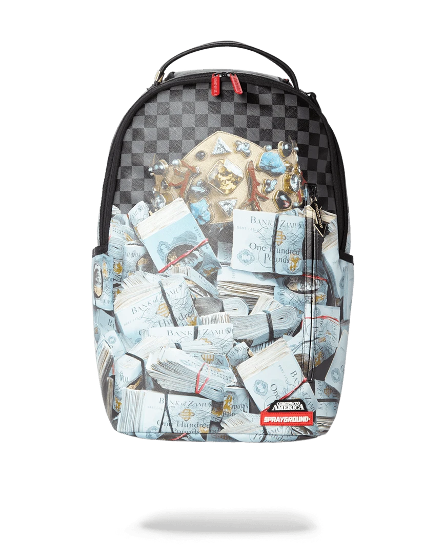• Custom Gold King of Zamunda Pendant Zipper Pulley • Dimensions: 18″ x 6″ x 11.5″ •Front zipper pocket• Side pockets • Zippered Stash pocket • Ergonomic mesh back padding• Adjustable Straps for custom sizing • Nylon Zippers with Metal Hardware • Metal “Sprayground Authentic” badge •Slide through back sleeve connects to Carry on luggage to free your hands
