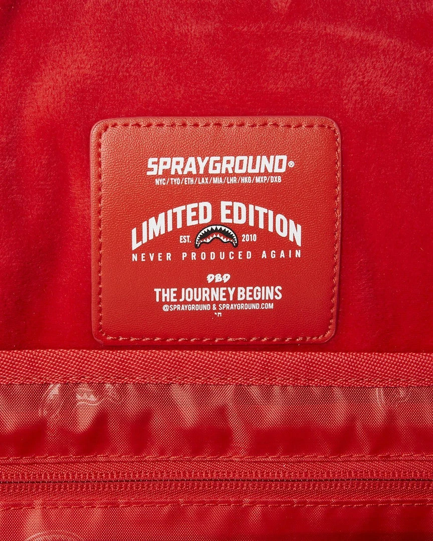 Dimensions: 18″ x 6″ x 11.5″ • Front zipper pocket • Side pockets • Zippered Stash pocket • Separate velour sunglass compartment • Ergonomic mesh back padding • Adjustable Straps for custom sizing • Gold zippers with metal hardware • Metal “Sprayground Authentic” badge • Slide through back sleeve connects to carry-on luggage to free your hands