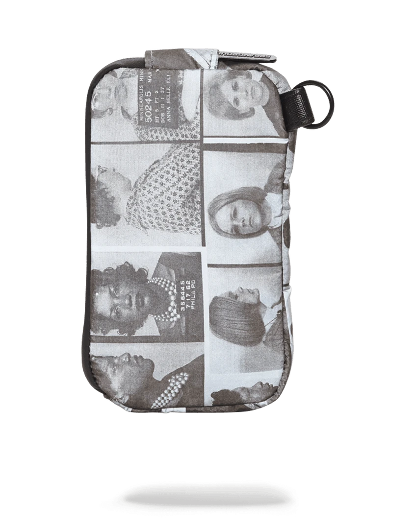 3M reflective small pouch keychain from LQS x DBD Collaboration for Scammer Collection. Featuring black and white printed mugshots of powerful women convicted for crimes throughout history. Features smell-proof pockets.
