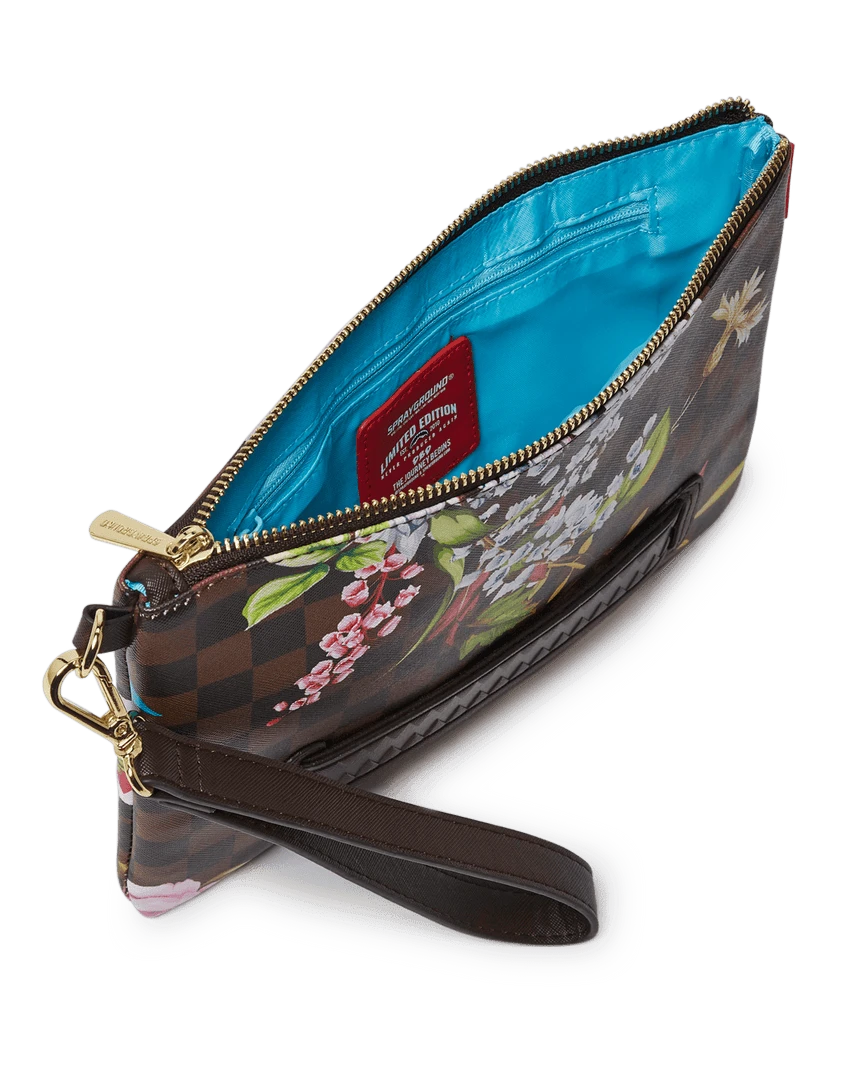Pouch with removable wristlet strap, Handle on front panel, Zip Closure, secret stash pocket on side seam