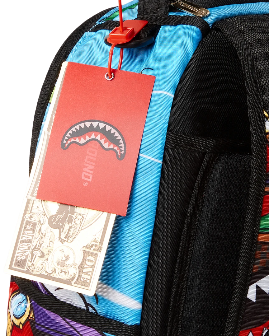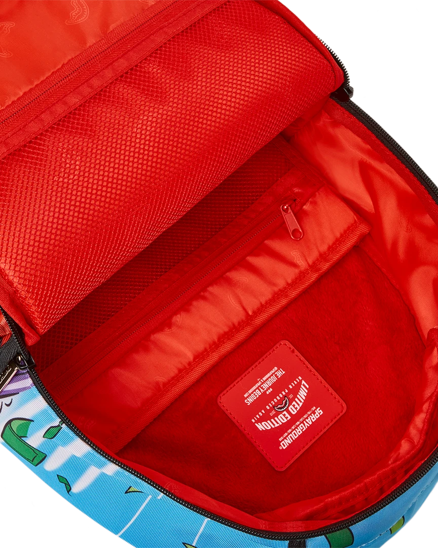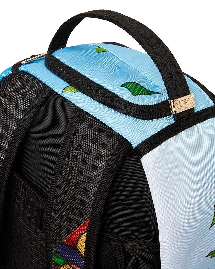 Dimensions: 18″ x 6″ x 11.5″ • Front zipper pocket • Side pockets • Zippered Stash pocket • Separate velour sunglass compartment • Ergonomic mesh back padding • Adjustable Straps for custom sizing • Green zippers with metal hardware • Metal “Sprayground Authentic” badge • Slide through back sleeve connects to carry on luggage to free your hands