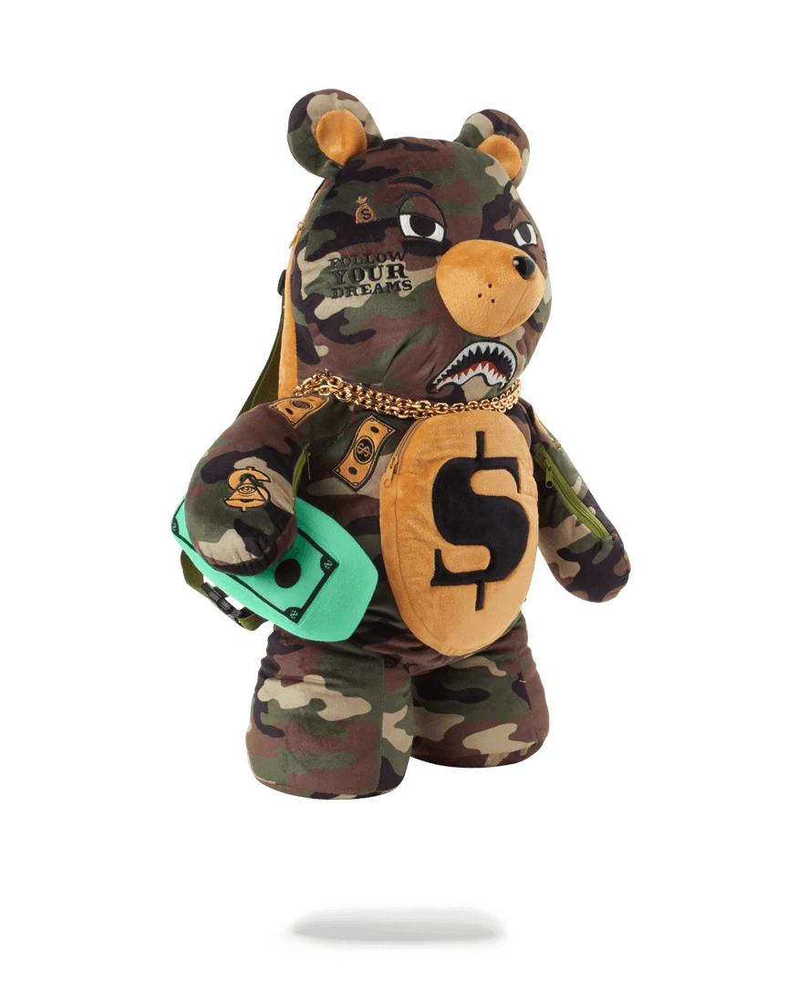 2 Gold Necklaces. Money Stack. Dimensions: 25” x 7” x 12“ • Zippered pocket on belly • Zippered pockets on each arm • Large zippered pocket on back panel • Adjustable Straps for custom sizing