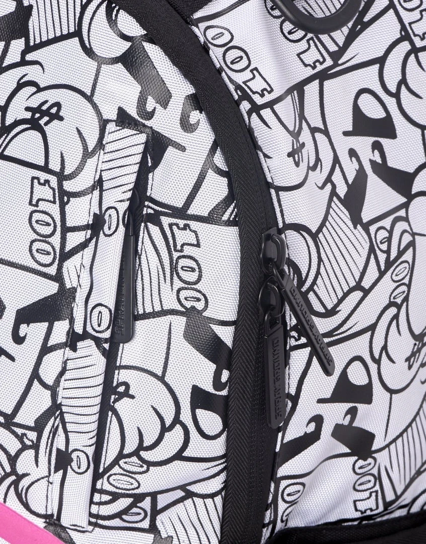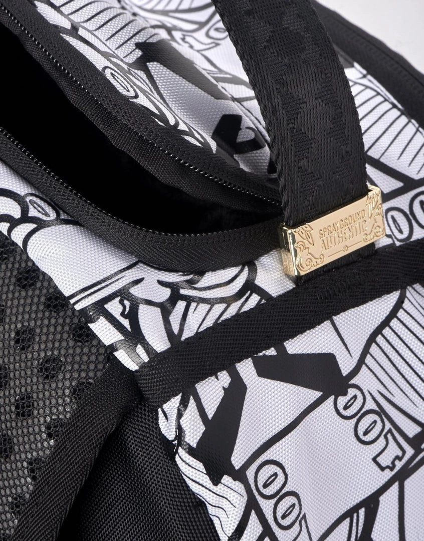 Dimensions: 18″ x 6″ x 11.5″ • Front zipper pocket • Side pockets • Zippered Stash pocket • Separate velour sunglass compartment • Ergonomic mesh back padding • Adjustable Straps for custom sizing • Black zippers with metal hardware • Metal “Sprayground Authentic” badge • Slide through back sleeve connects to carry-on luggage to free your hands