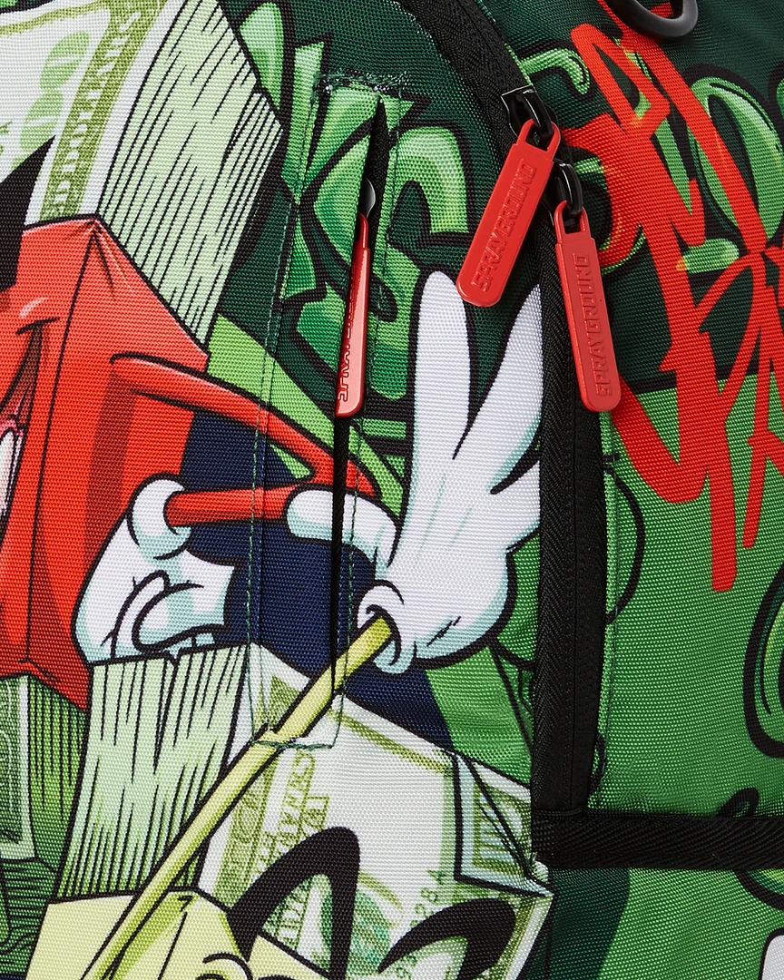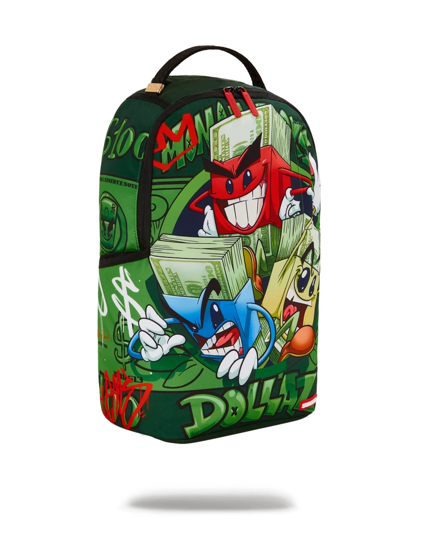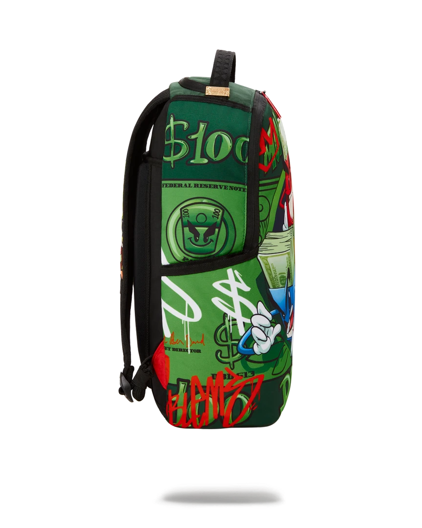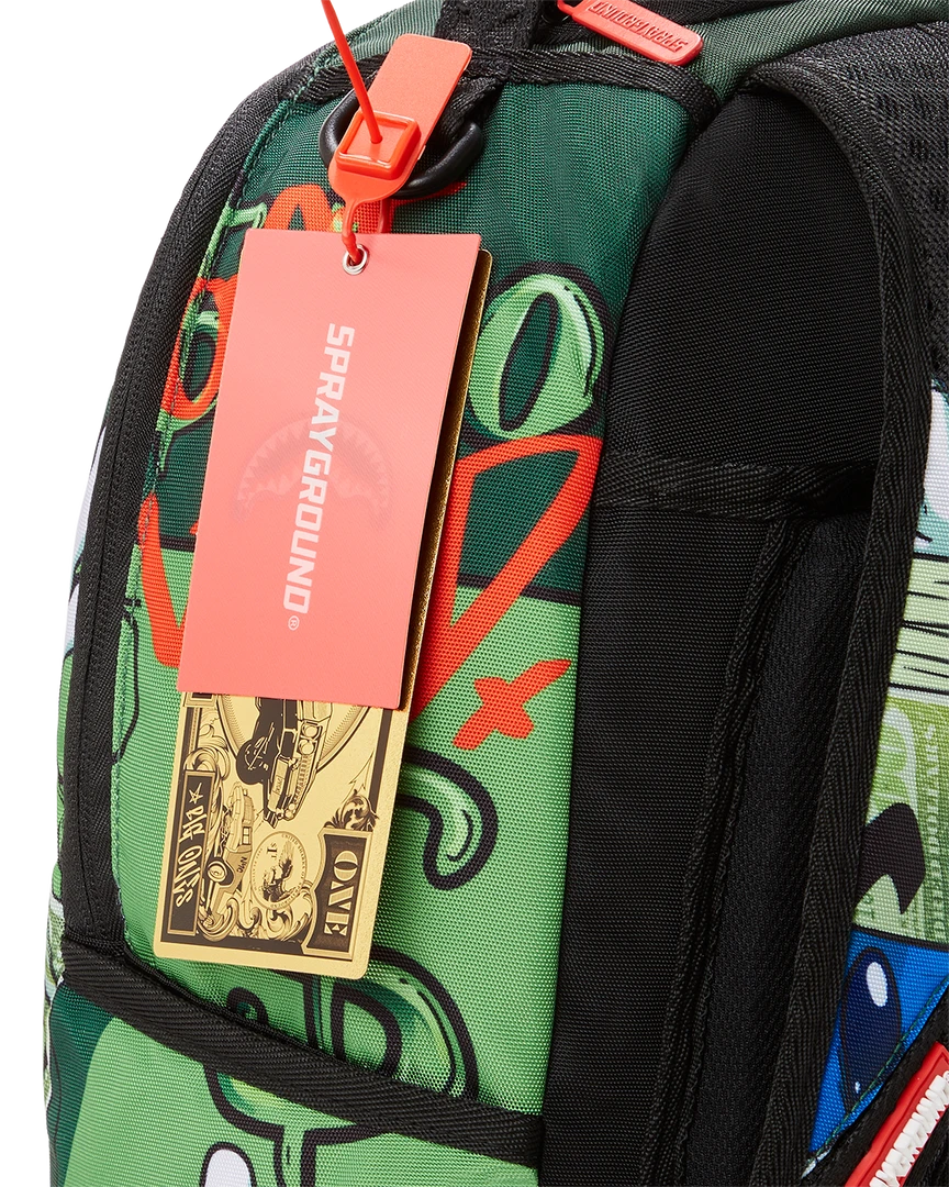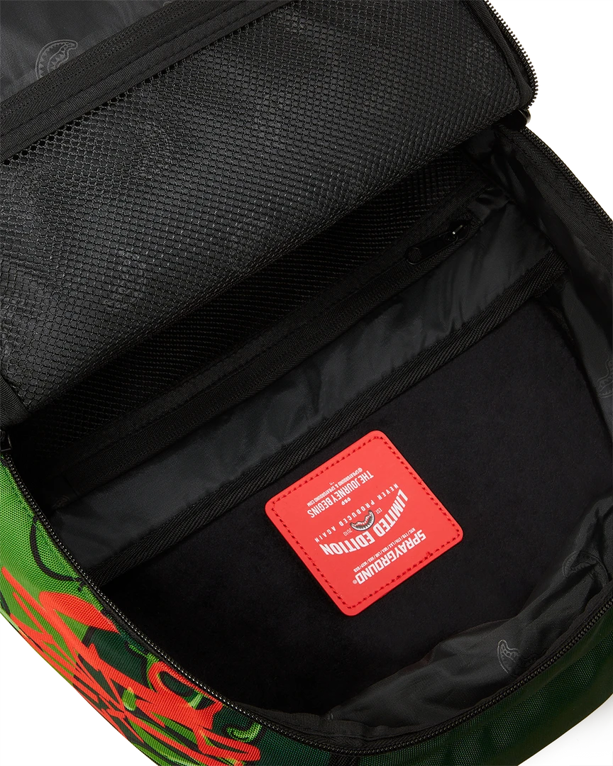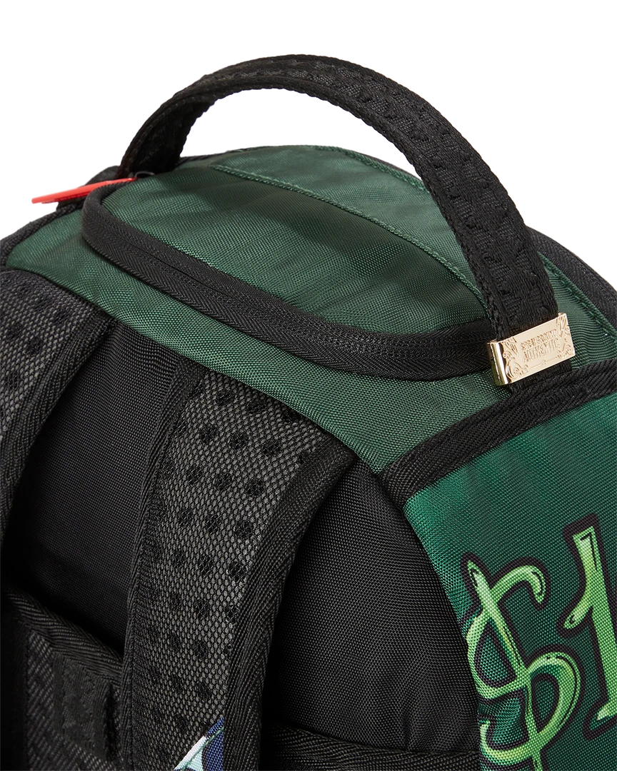 Dimensions: 18″ x 6″ x 11.5″ • Front zipper pocket • Side pockets • Zippered Stash pocket • Separate velour sunglass compartment • Ergonomic mesh back padding • Adjustable Straps for custom sizing • Green zippers with metal hardware • Metal “Sprayground Authentic” badge • Slide through back sleeve connects to carry on luggage to free your hands