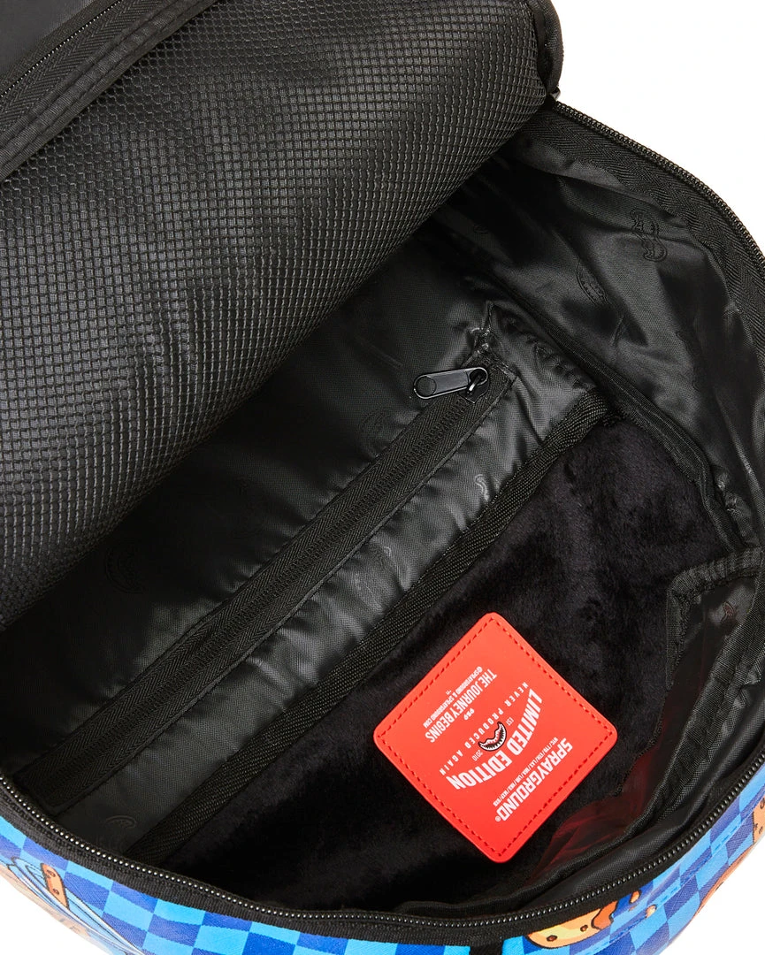 Dimensions: 18″ x 6″ x 11.5″ • Front zipper pocket • Side pockets • Zippered Stash pocket • Separate velour sunglass compartment • Ergonomic mesh back padding • Adjustable Straps for custom sizing • Gold zippers with metal hardware • Metal “Sprayground Authentic” badge • Slide through back sleeve connects to carry-on luggage to free your hands