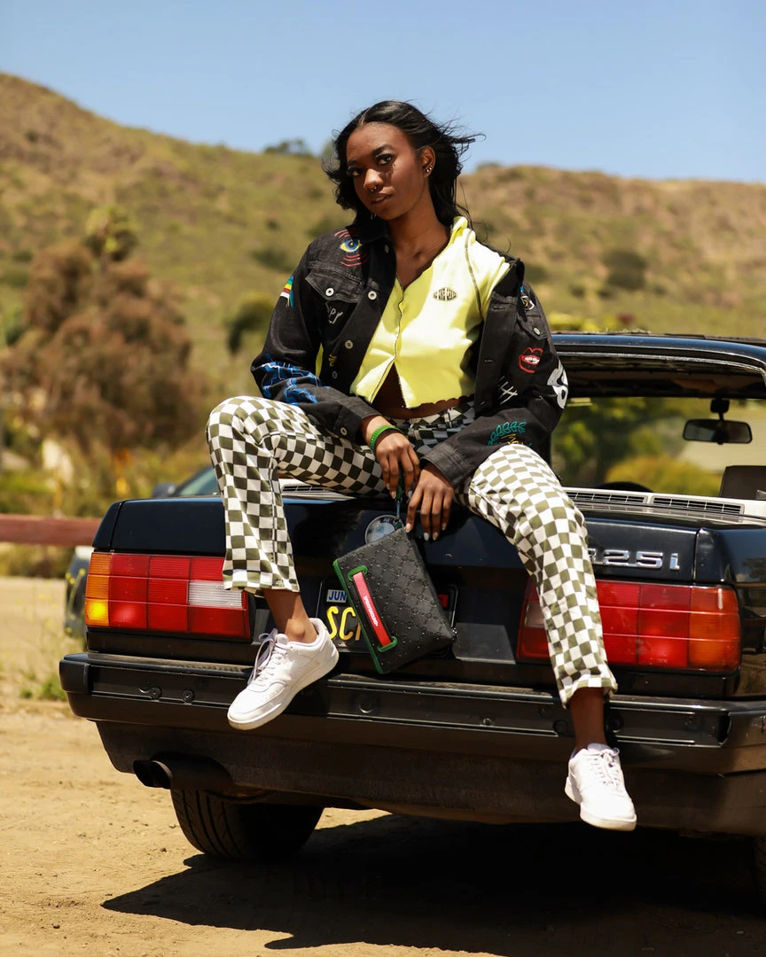Pouch with removable wristlet strap, Handle on front panel, Zip Closure, secret stash pocket on side seam