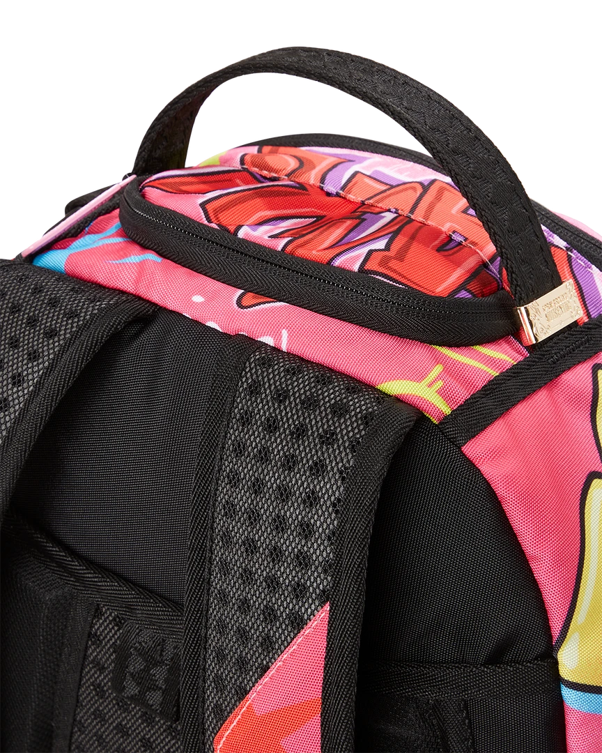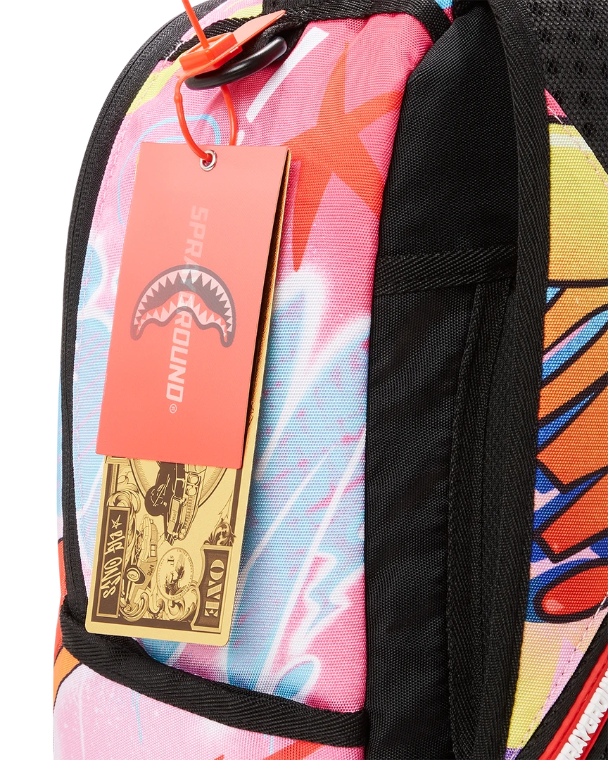 Dimensions: 18″ x 6″ x 11.5″ • Front zipper pocket • Side pockets • Zippered Stash pocket • Separate velour sunglass compartment • Ergonomic mesh back padding • Adjustable Straps for custom sizing • Green zippers with metal hardware • Metal “Sprayground Authentic” badge • Slide through back sleeve connects to carry on luggage to free your hands