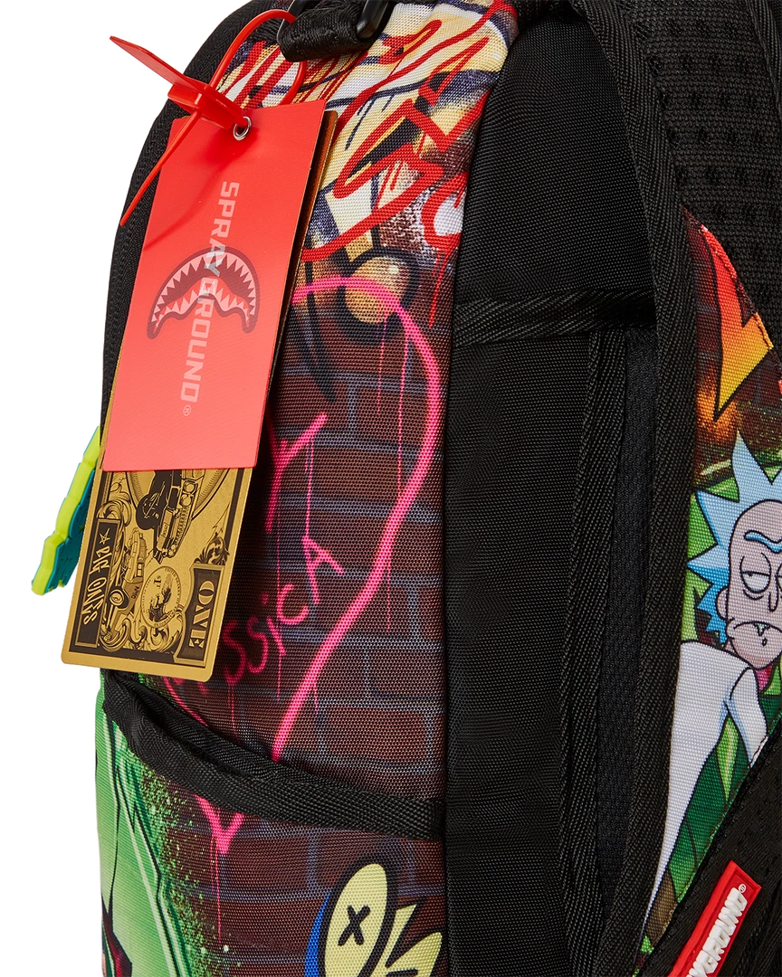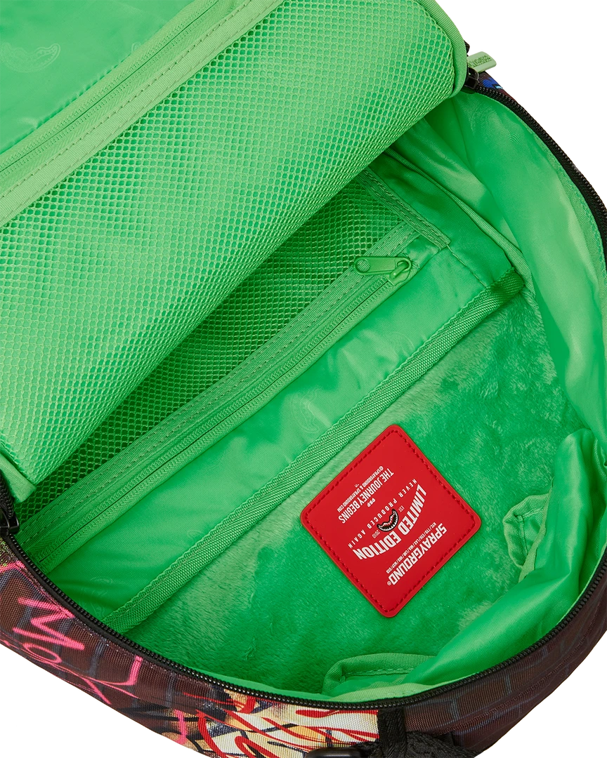 Dimensions: 18″ x 6″ x 11.5″ • Front zipper pocket • Side pockets • Zippered Stash pocket • Separate velour sunglass compartment • Ergonomic mesh back padding • Adjustable Straps for custom sizing • Green zippers with metal hardware • Metal “Sprayground Authentic” badge • Slide through back sleeve connects to carry on luggage to free your hands